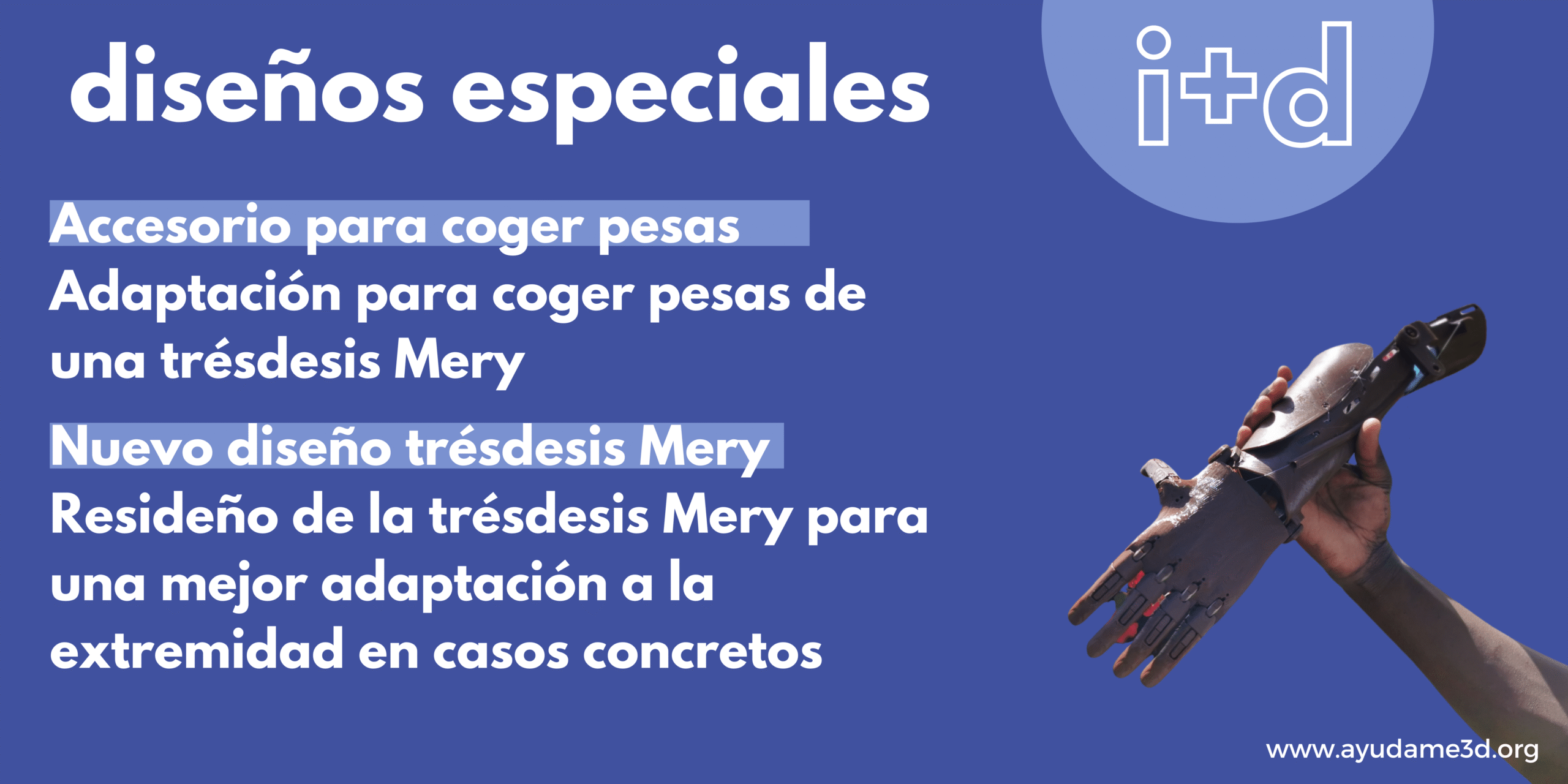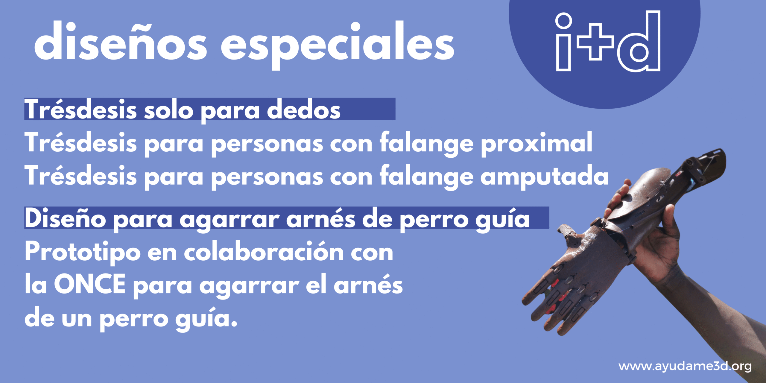 Hemos creado un nuevo prototipo de trésdesis para personas con falange proximal y con falange amputada. Es decir, una trésdesis solo para el dedo que permite el movimiento de la falange. Estamos desarrollando la primera trésdesis adaptada para agarrar el arnés de un perro guía en colaboración con la ONCE y adaptando el diseño de una trésdesis Mery para crear un accesorio que permitirá a la persona que lo use hacer pesas. Además, hemos realizado una modificación del diseño de la trésdesis Mery para una mejora adaptación a la extremidad en casos concretos.